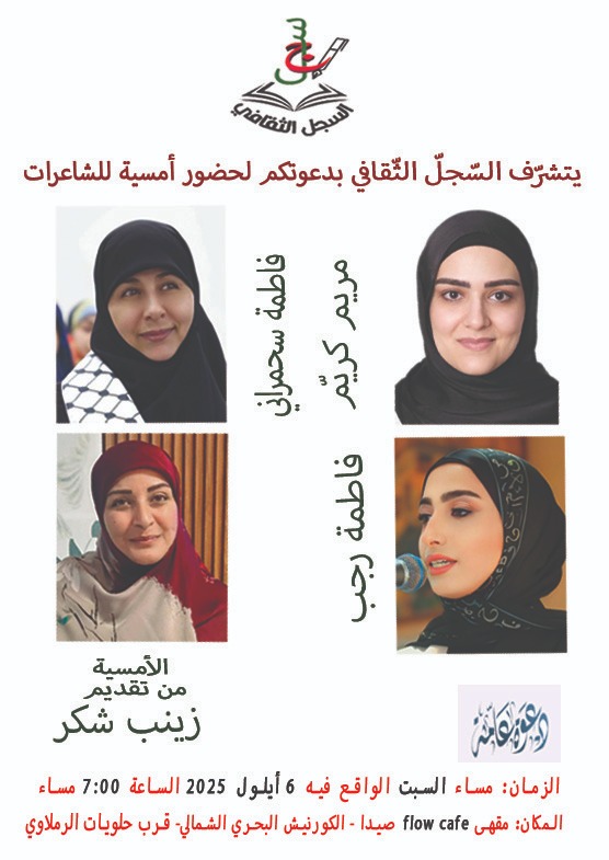 إستمرارا لأنشطته الثقافية ، ينظم السجل الثقافي أمسية شعرية للشاعرات فاطمة سحمراني ومريم كريم وفاطمة رجب ، وذلك يوم السبت 6 أيلول /شتنبر 2025 في الساعة الخامسة مساء بمقهى flow بالكونيش البحري الشمالي قرب حلويات الرملاوي بمدينة صيدا . هذه الأمسية الشعرية تقدمها زينب شكر ، ويشرف عليها الشاعر طه العبد . وتجدر الإشارة أن السجل الثقافي سيوقع مستقبلا إتفاقية شراكة وتعاون مع شبكة المقاهي الثقافية بالمغرب ، بعد تنظيمهما لأمسيات شعرية إفتراضية.