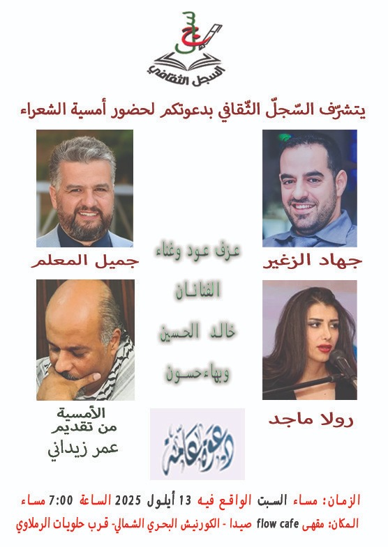 يواصل السجل الثقافي بلبنان أنشطته الثقافية والإشعاعية بتنظيم أمسية شعرية يشارك فيها جهاد الزغير وجميل المعلم ورولا ماجد ، إضافة لعازف العود خالد الحسين والفنانة بهاء حسون وذلك يوم السبت 13شتنبر /أيلول 2025 على الساعة الخامسة مساء بمقهى flow بالكونيش البحري الشمالي صيدا بلبنان … هذه الأمسية من تقديم عمر زيداني ، وإشراف طه العبد . وتجدر الإشارة أن اللقاء الشعري الماضي تم الإعلان فيه عن قرب توقيع إتفاقية شراكة وتعاون مع شبكة المقاهي الثقافية بالمغرب .