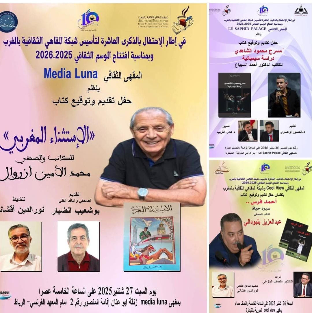 تفتتح شبكة المقاهي الثقافية بالمغرب موسمها الثقافي الجديد 2025/2026 بمدينتي القنيطرة والرباط حسب البرنامج التالي : أحمد السبياع وكتاب مسرح الشاهدي …. يوم الخميس 25 شتنبر 2025 على الساعة الخامسة بعد الظهر بمقهى “لوسافير بلاص ” بئر الرامي بالقنيطرة ، ينظم حفل تقديم و توقيع كتاب ” مسرح محمود الشاهدي دراسة سيميائية ” للكاتب الدكتور أحمد السباعي ، ويقدمه الدكتور الحسين أوعسري ، في حين يسير اللقاء الدكتور عادل القريب ، ويشرف عليه الدكتور أبوالوفاء البقالي . بلبودالي يوقع سيرة أحمد فرس وبالمقهى الثقافي ” كوول فيو ” الحوزية بالقنيطرة…